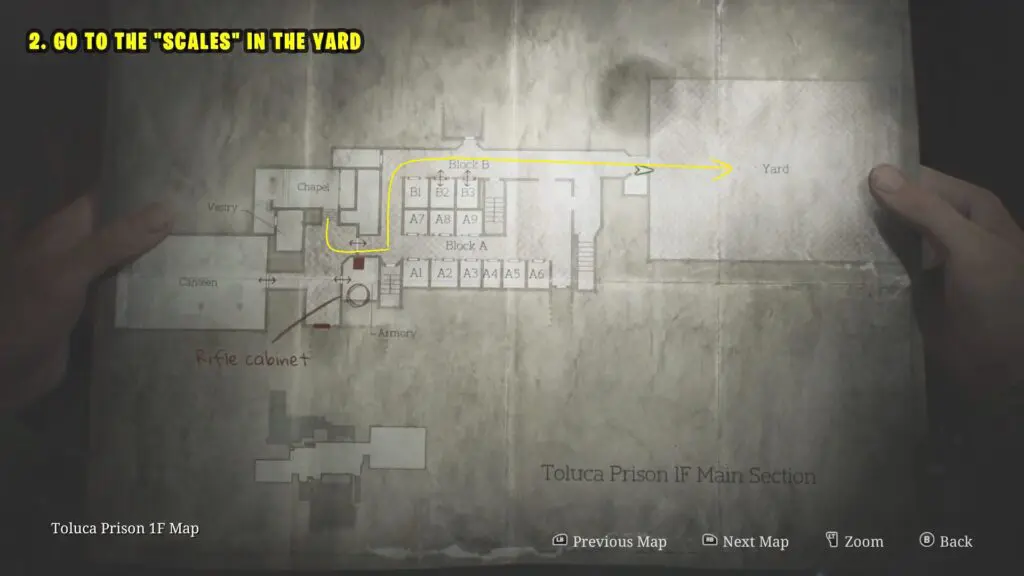 Follow the path through Block B as shown in the map below into the Yard Area. Interact with the Statue in the yard where you need to solve the weight puzzle.