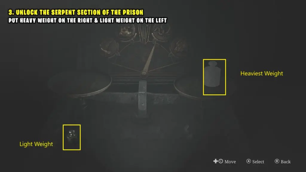 To solve the weight puzzle, place the heaviest weight on the right scale and the smallest weight on the left scale. This should unlock the Serpent door.