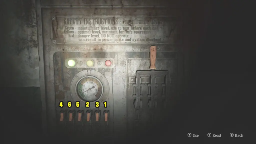 The player must flip switches in the correct sequence to overload the power panel. Once the switches are flipped correctly, pull the lever down to unlock the prison cells. Refer to the image below.