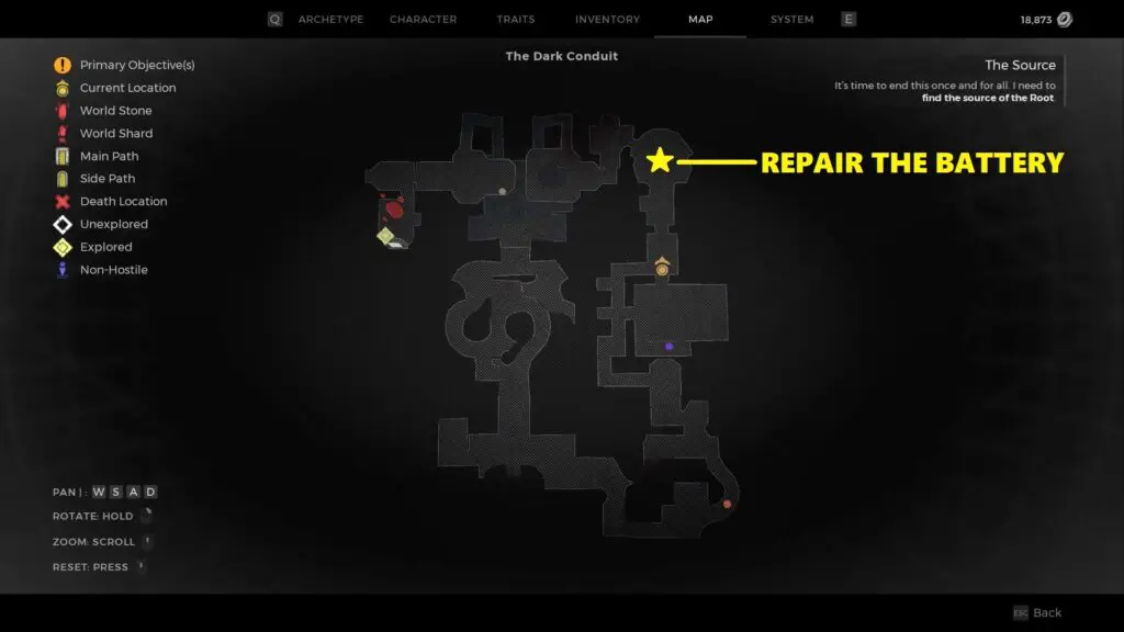 Within this dungeon, locate a room with a cylindrical structure. In that room, your task is to repair the battery and reactivate power for the ship.