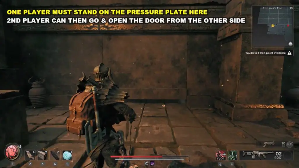 Starting from the second checkpoint, if you move towards the right, you will come across a locked door accessible only in Co-op mode. To open it, both players need to stand on two separate pressure plates simultaneously. The location is marked on the map.