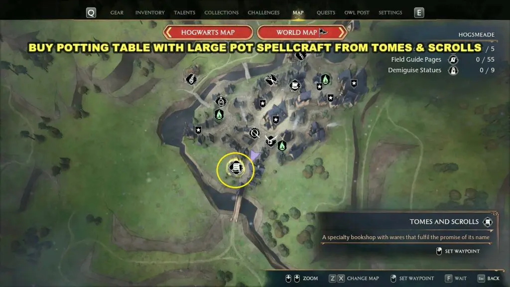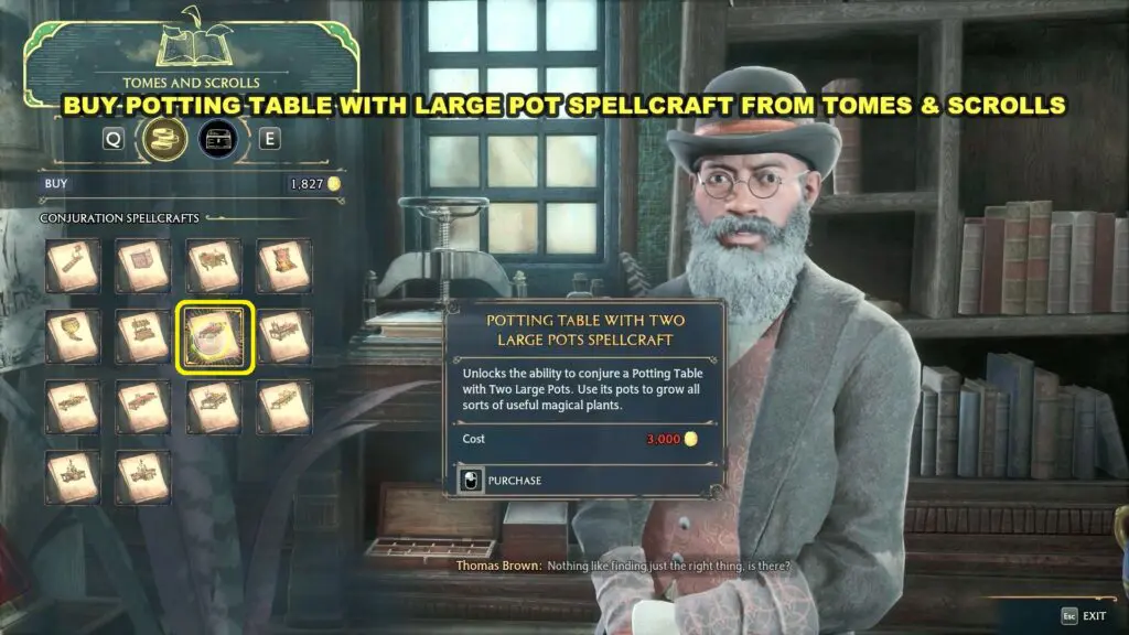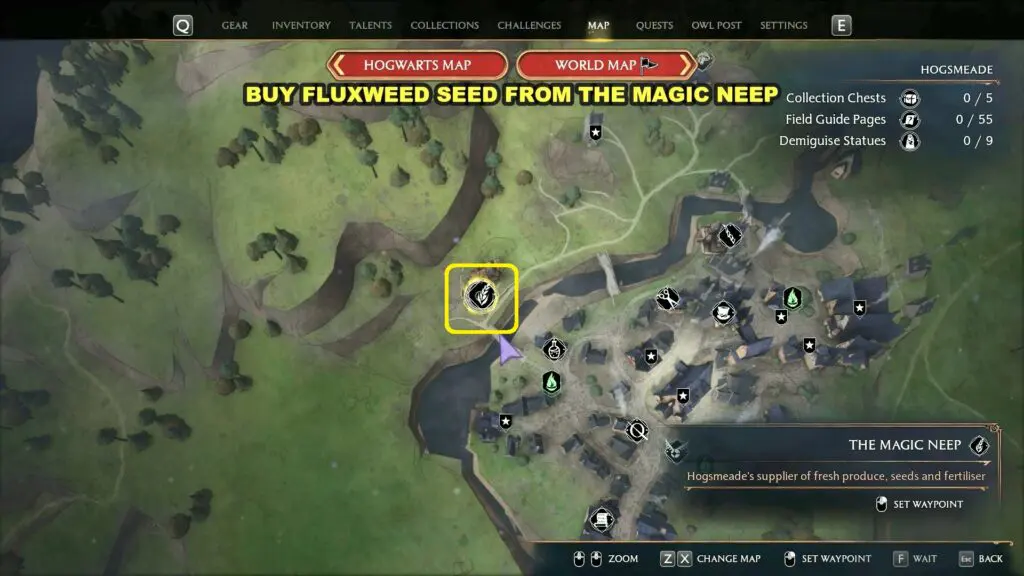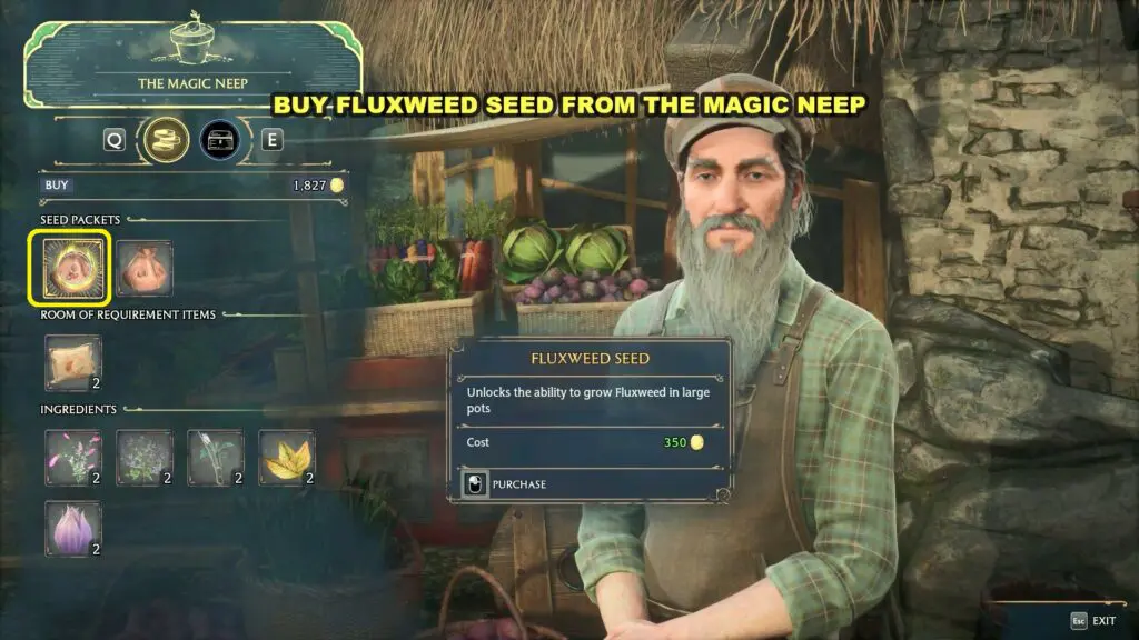 Next, head to the Magic Neep shop on the west side of Hogsmeade. Buy the Fluxweed Seed for 350 Galleons coins. Refer to the below image for the location.
