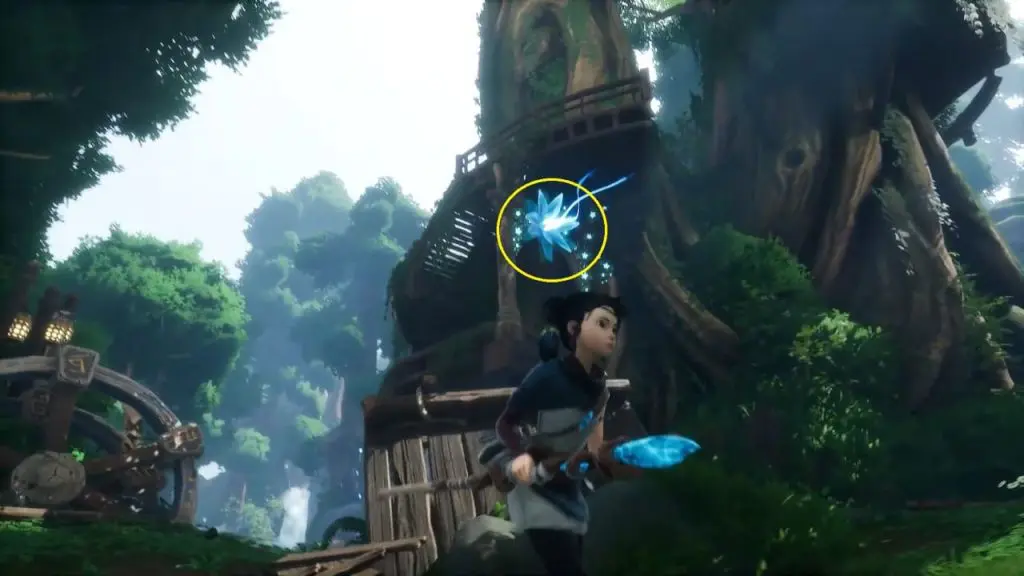 First, make your way around the base of the tree and circle it until you see a Blue Flower. Shoot an arrow at the blue flower to bring you up to the first platform.
