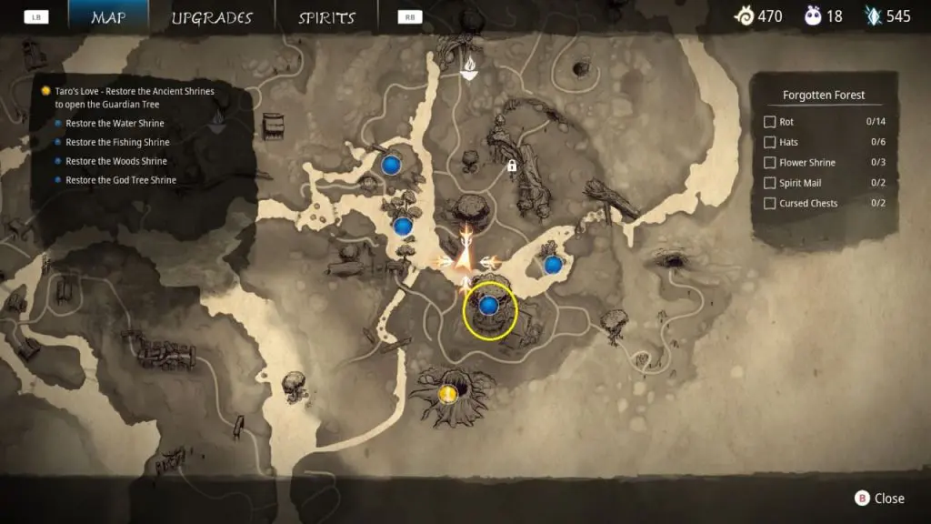 This article will show you how to reach and restore the God Tree Shrine. When crossing the Forgotten Forest, you need to clear out the corruption from the Water, Fishing, Woods, and God Tree Shrine. The Forgotten Forest is home to the God Tree Shrine. To get to this area, you must first follow the main story until Rosu tells you to meet him there during the objective ‘Meet Rusu in the Forgotten Forest’. Forgotten Forest is accessed via the gate in Taro’s Tree. Here Rosu will explain to you inside the Forgotten Forest that the Tree Shrines have been corrupted and will assign you the task of restoring them. At this point, each of the four Shrine will be marked on the map.