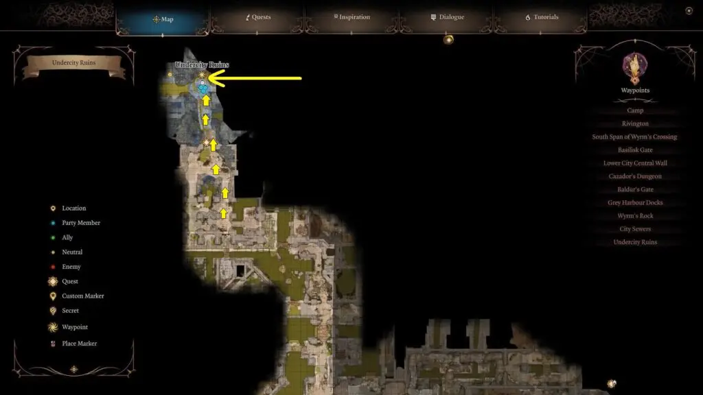 Ascend the stairs and continue north on the linear walkway to reach the Undercity Ruins Waypoint.