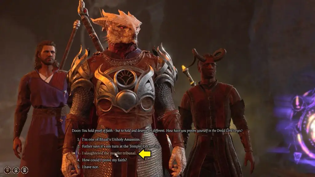 The door will request proof of our Lord’s faith. Select the Dialogue, and the door will open. “I slaughtered the murder tribunal“