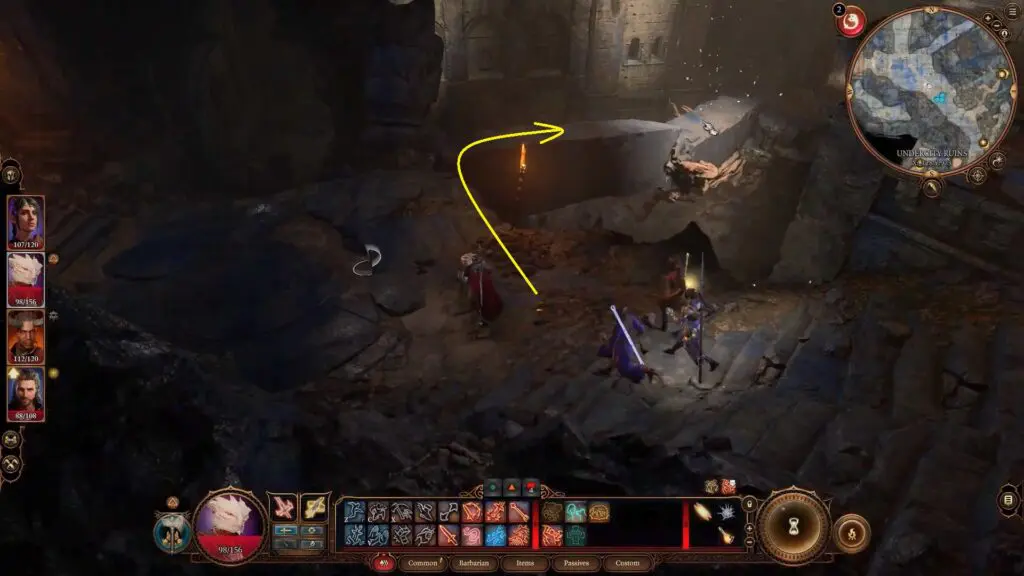 Enter the room and fight the “Reaper of Bhaal Gruntman.” Then go over the gap via the fallen stone pillar.