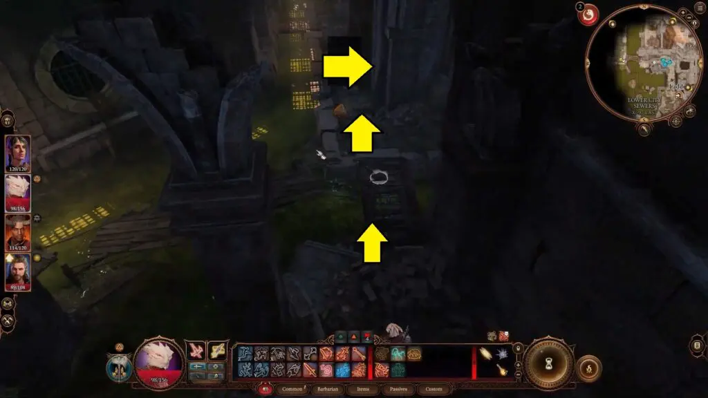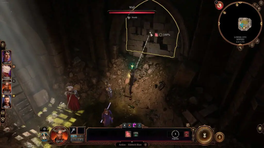 Upon entering the sewer, employ the Eldritch Blast spell to explode the loose stone wall to your left.