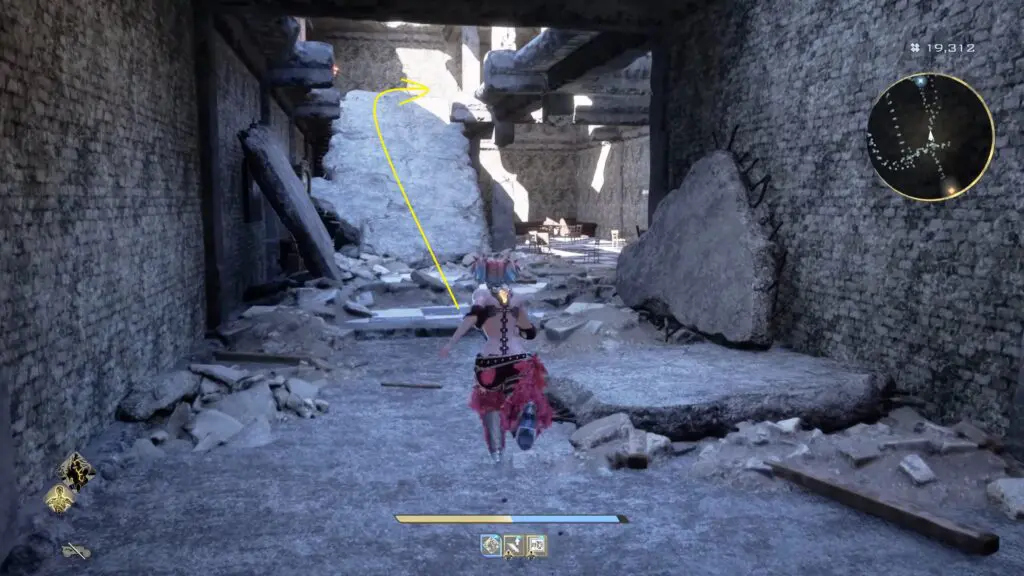 Begin by fast traveling to the Cliffside Ruins travel point and enter the nearby hotel building. Follow the interior path and climb up using the fallen section of the ceiling to reach the upper floor.