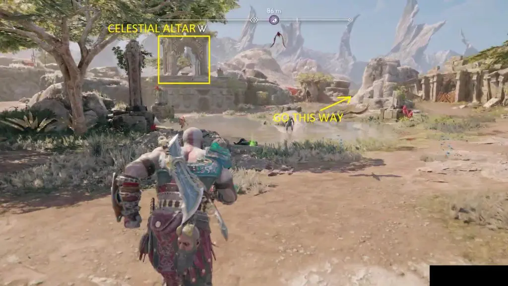 Jump down from the east side of the Celestrial Altar. Then turn right and climb up the wall ahead. Keep moving ahead hugging the right wall. This will take you to a cave with a cave behind it as shown in the picture below. Cross the canyon from the bridge and enter the cave.