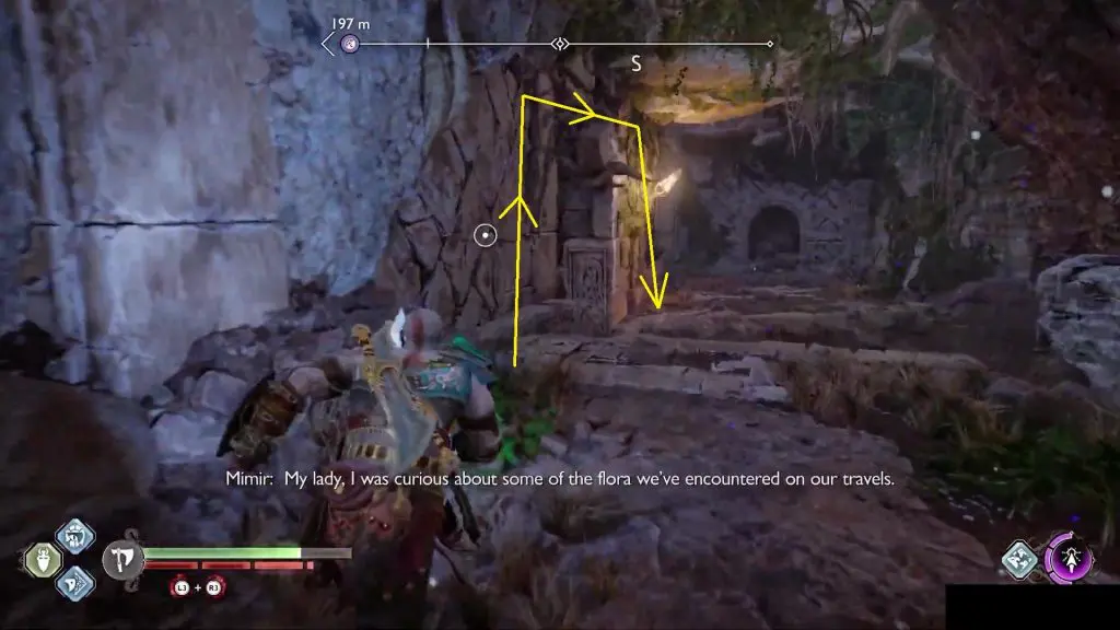 After climbing up the wall, turn left and you will see a small puddle of water. Behind the puddle is a Celestrial Altar as shown in the picture below. Go right from the puddle and continue until you reach a small tunnel on the left side as shown in the second picture below. Use the hook in the tunnel to jump to the other side. Then go left and climb up the wall ahead to reach the Celestrial Altar. Interact with it to clear the path.