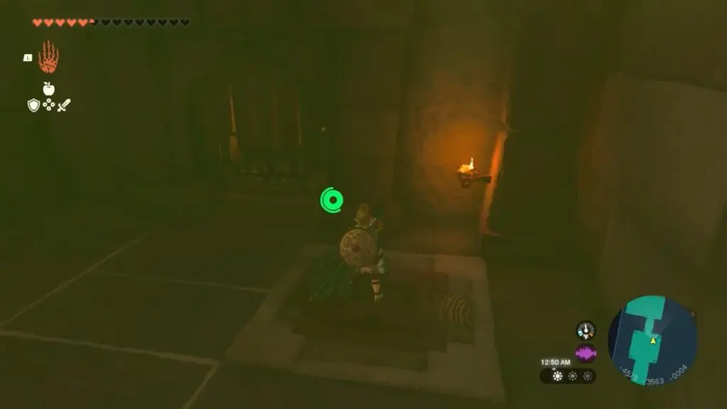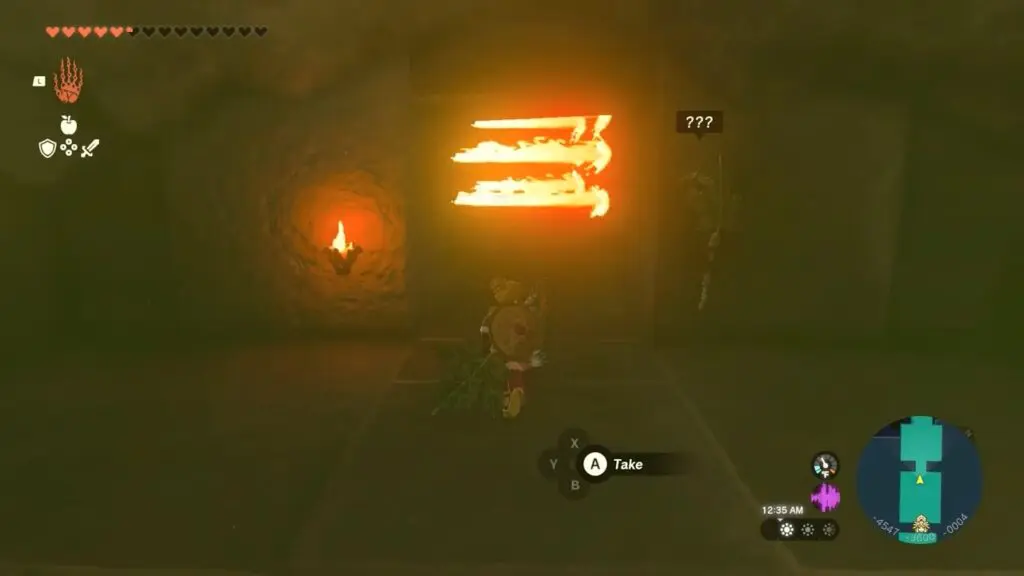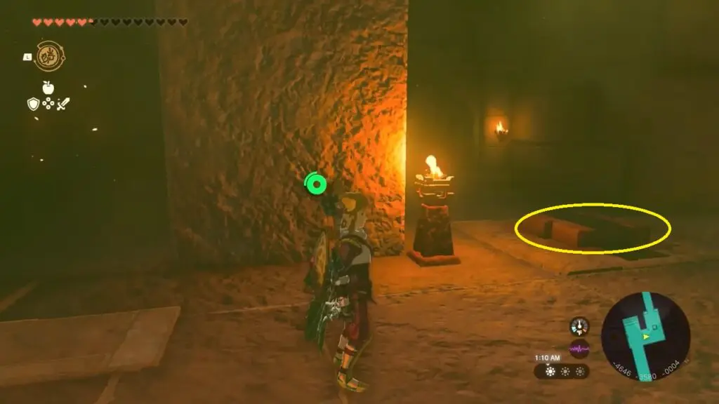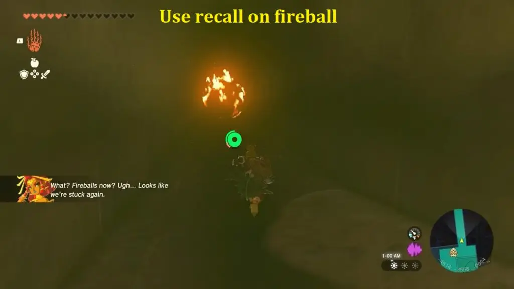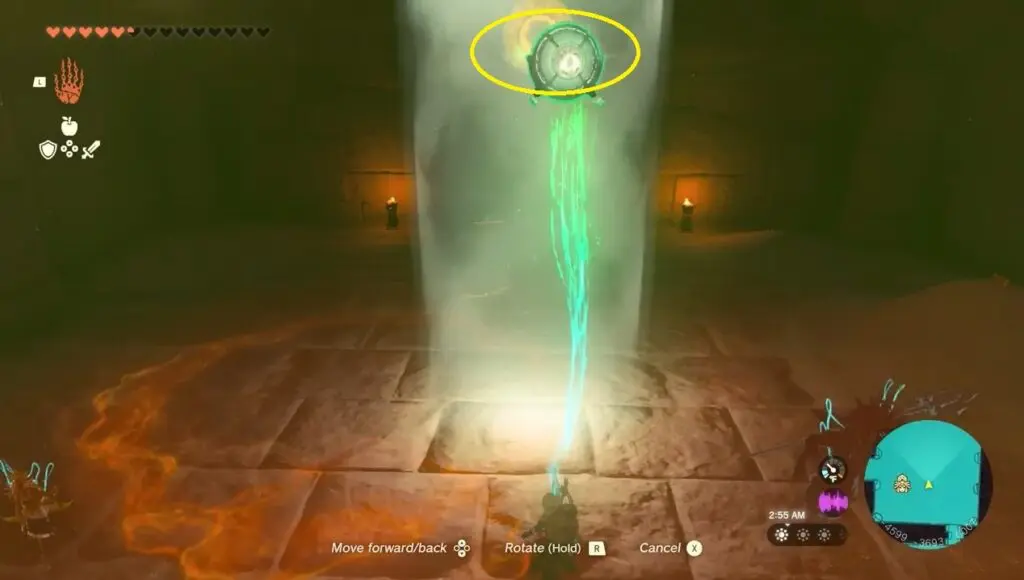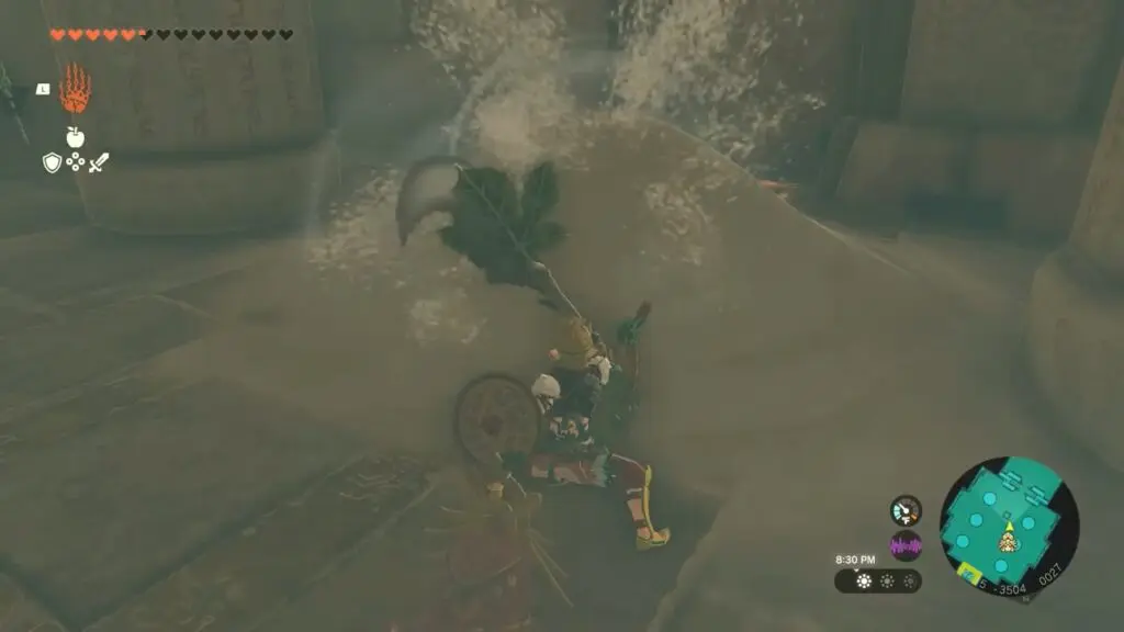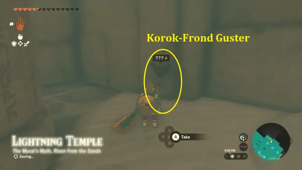 Following the boss fights, utilize Riju’s lightning strike to target and shoot the purple hives, which will unlock the temple. Head inside the temple to discover a weapon named “Korok-Frond Guster” Equip this weapon to effectively clear sand.