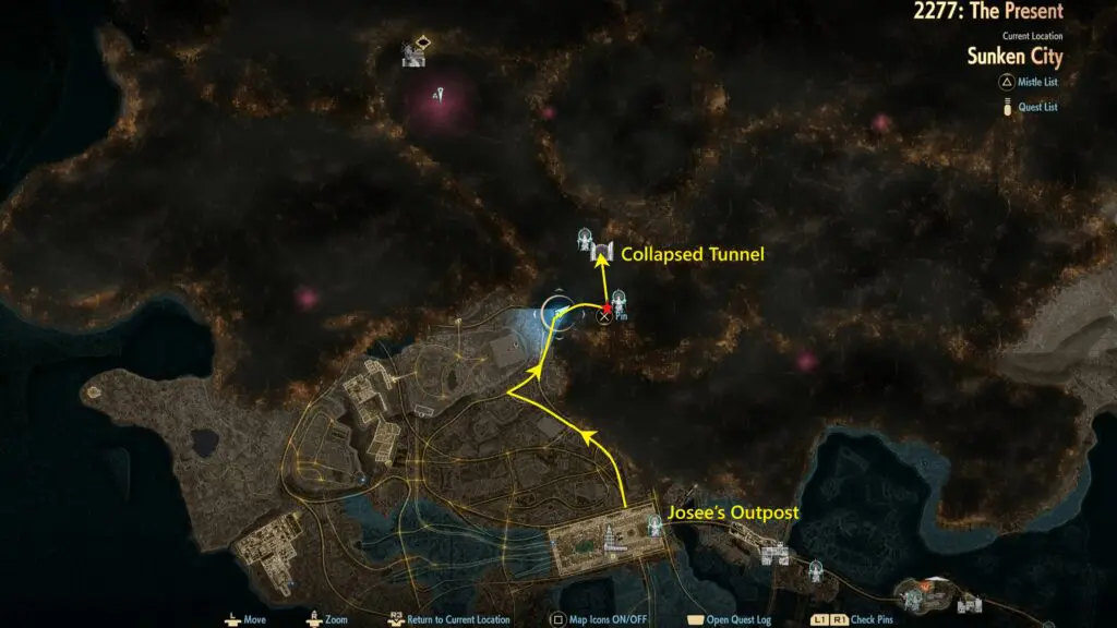 Start by opening your world map to find Josee’s Outpost as a reference point. From Josee’s Outpost, move north until you reach the highway. From the highway, do not go west toward the forest. Instead, proceed to the east side of the highway, cross the small bridge, and keep moving forward.