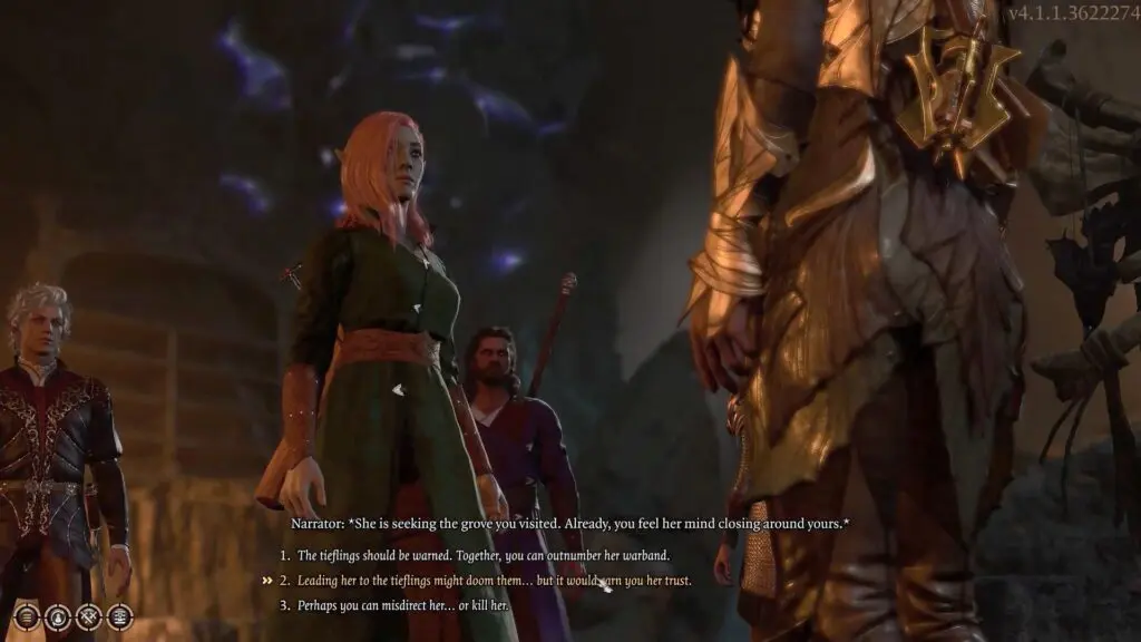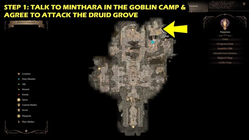Minthara will initially appear at a Goblin’s Hideout in Shattered Sanctum. Talk with her and either provide her with information on where to find the Druids or agree to keep an eye out for her. You’ll get on Minthara’s good side either way.