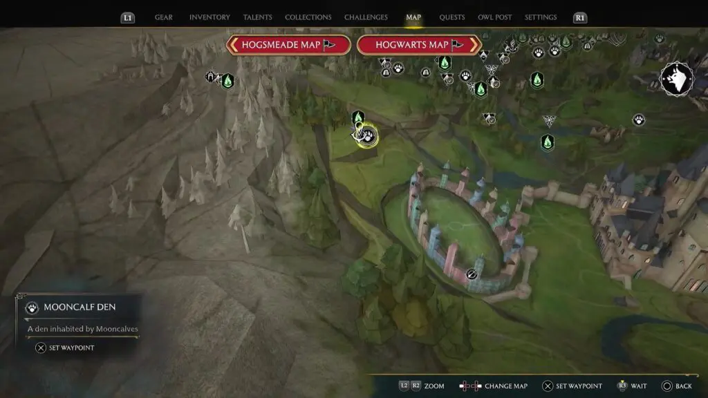 Upon arriving at the Mooncalf Den location, you won’t find any Mooncalf there. That is because they appear only during the night. Open your map and press the right joystick (R3) to change the time from Day to Night. Now the Mooncalves will appear at the marked location. Now simply use your Nab-Sack to rescue a Mooncalf. This will complete the objective.