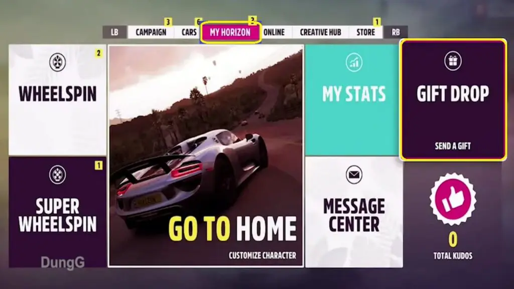 #2: There must have a minimum of 2 cars available in your garage, as you cannot gift a car you are already driving. Make your way to the My Horizon menu which you can access in the pause menu, and select the Gift Drop option. From here you can choose which car you would want to gift.