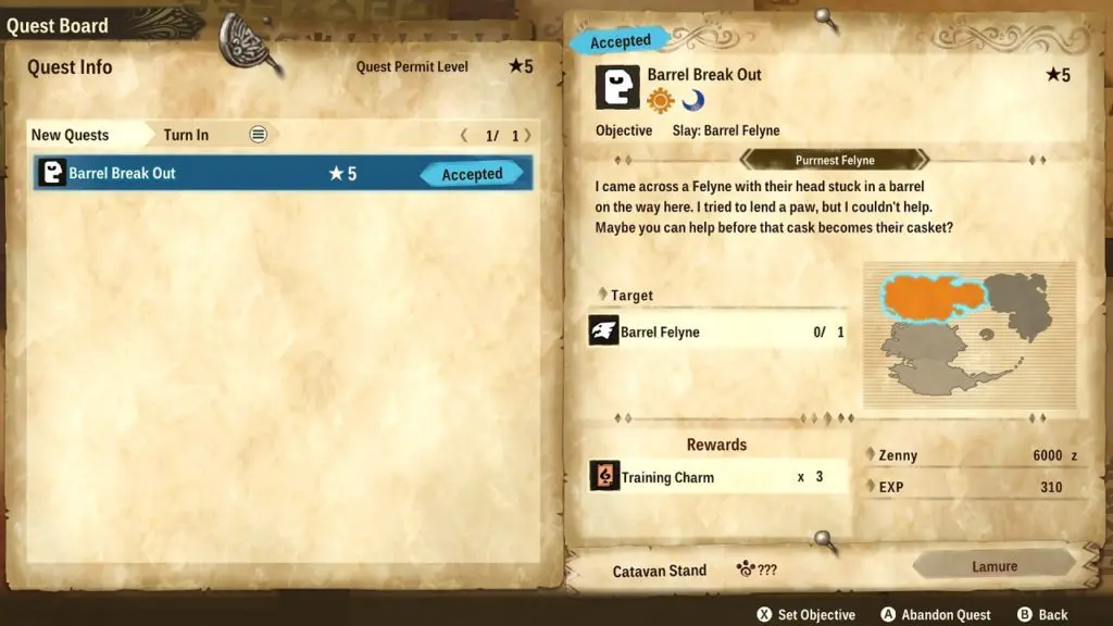 Subquests are optional missions that you get by talking to NPCs in Monster Hunter Stories 2 Wings of Ruin. People in need will ask you for help in form of Subquests. these are a great way to earn extra items, experience points, and zenny. You get the ‘Barrel Break Out’ subquest at a later stage in the game after you have reached Felyne Shelter in Lamure.