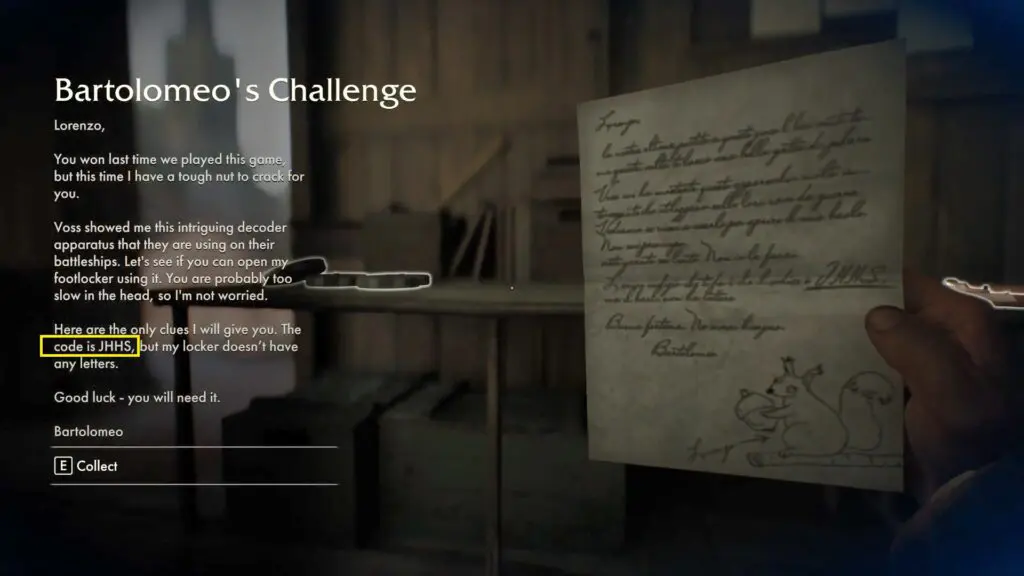 In this mystery, a player needs to decipher the code of Bartolomeo’s Challenge Note into numerical value. The code is J-H-H-S.