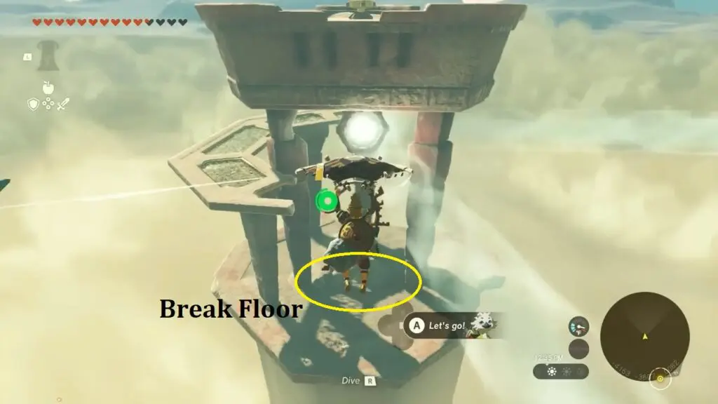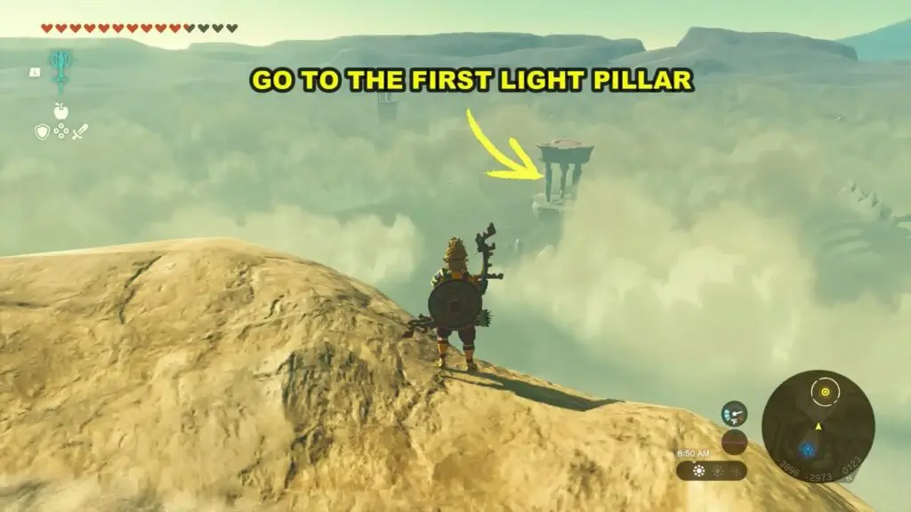 Glide to the first tower. Combine a weapon with a rock to create a hammer, then use it to break the breakable floor. This will uncover a mirror that emits a beam of light. Trace the path of the light beam deeper into the desert to discover the next tower.