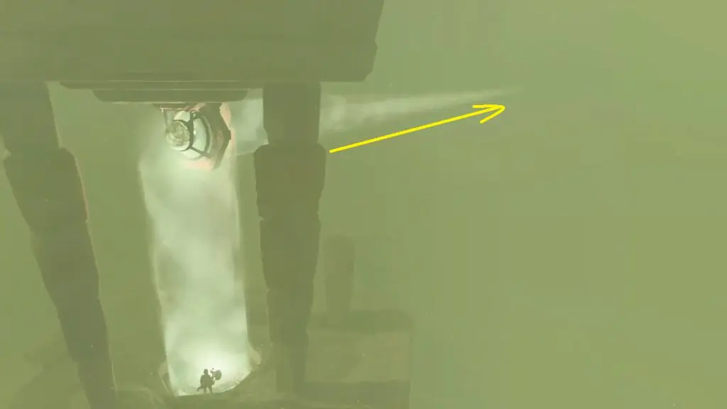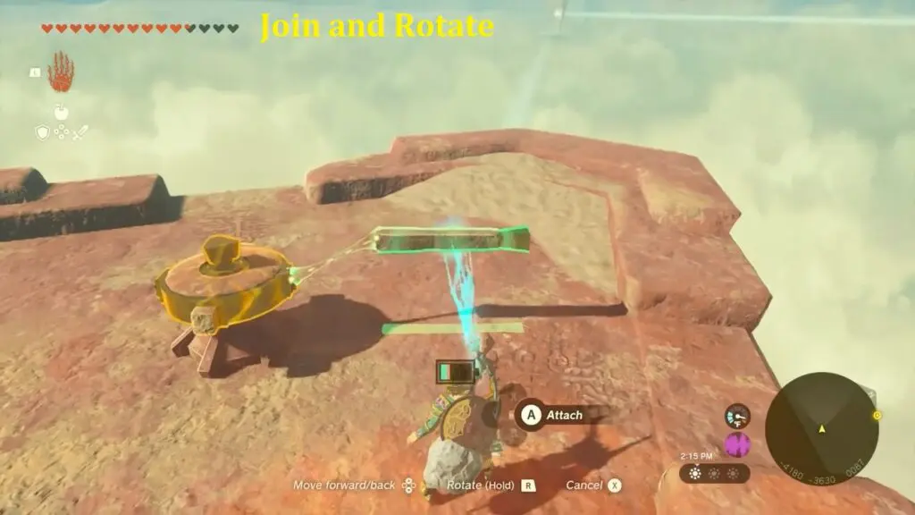 Continue to follow the new beam of light leading to the third tower. Utilize a nearby gust of wind to reach the tower’s summit and subsequently break its floor. This will reveal two green stones (platform) and four wooden sticks. Utilize the Ultrahand to connect at least one of the wooden sticks to a platform.
