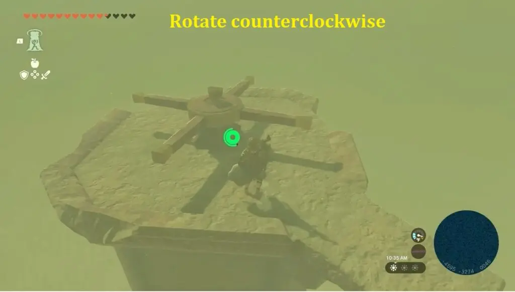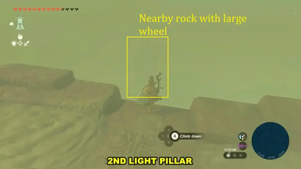 As you follow the beam of light, you will arrive at the second platform with three pillars. Climb onto a nearby rock and utilize the Ultrahand to rotate the large wheel at the top counterclockwise until the tower reflects the beam of light.