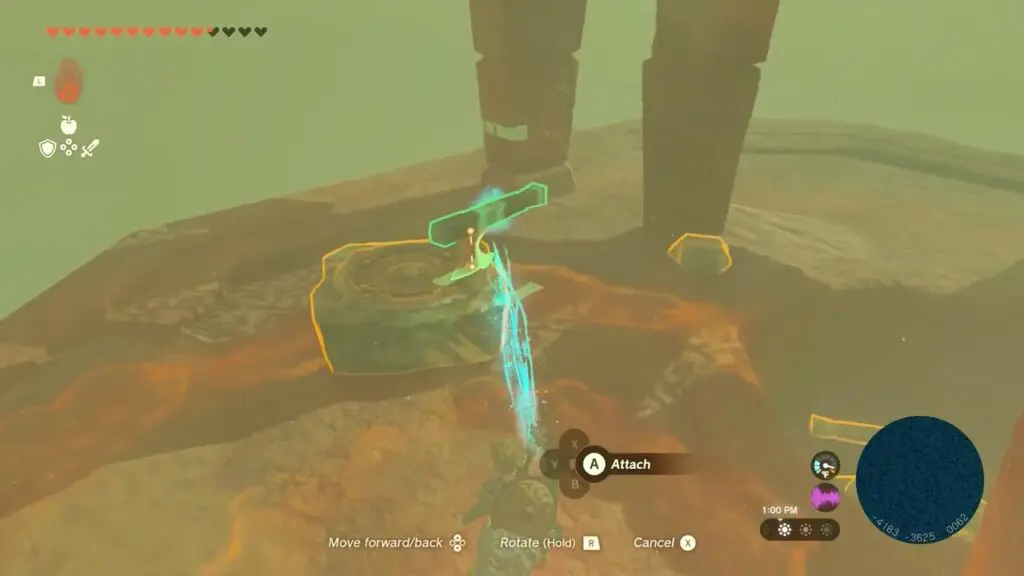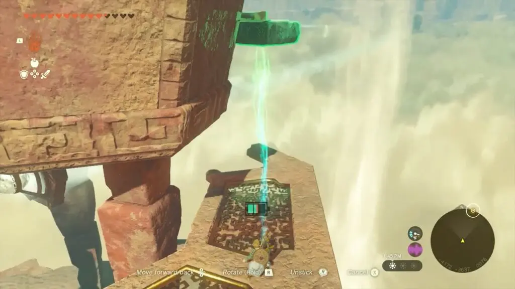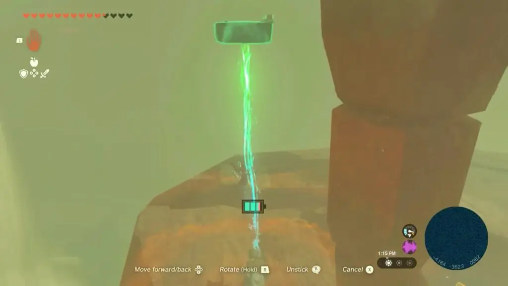 Climb the pillar to reach the balcony, then use the Ultrahand to retrieve the stones. Allow the battery to recharge fully. Once they are fully recharged, lift them again to transfer them to the top of the tower.