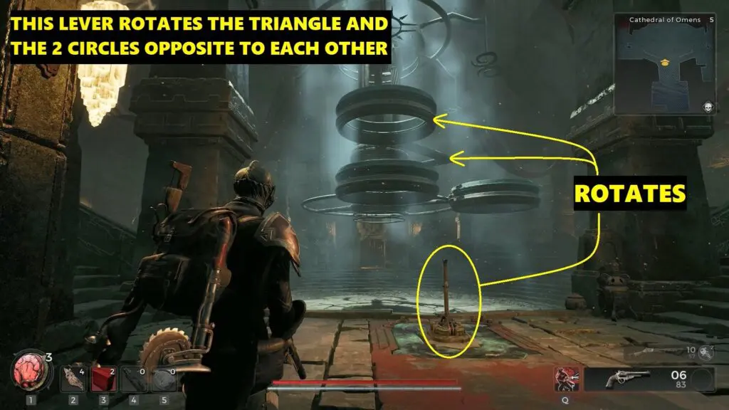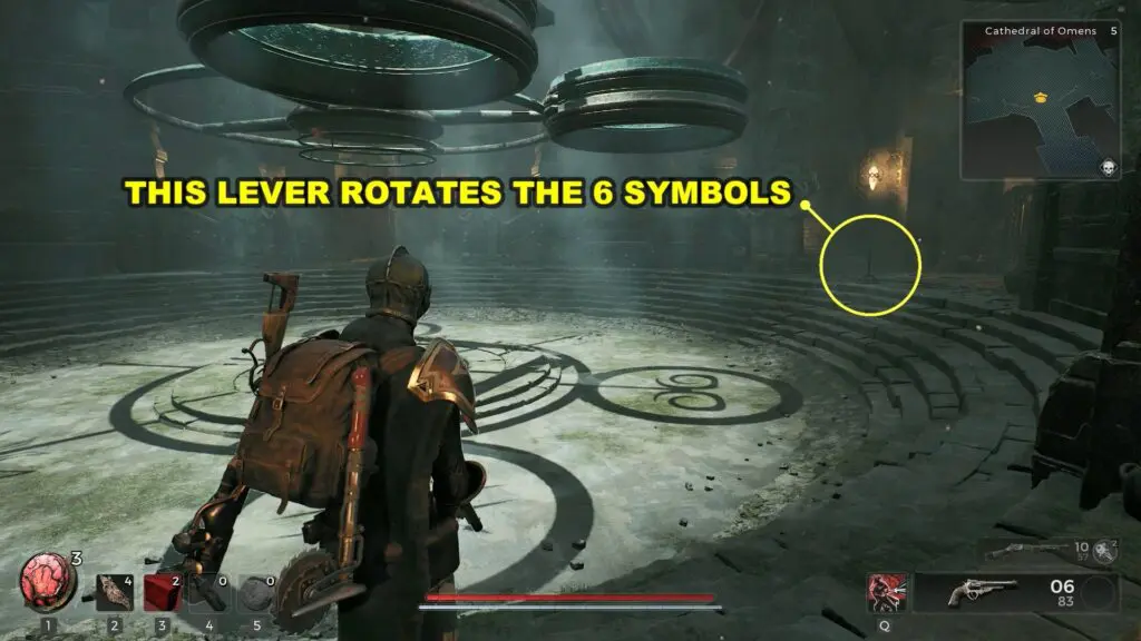 When you reach the Cathedral, you’ll find a large room with several symbols above the floor, with a skylight reflecting their shadow on the ground. Symbols have three levers: