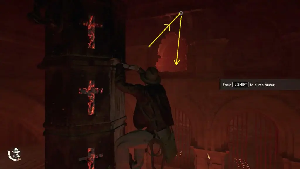Now go back to the main hall. Use your whip to climb up the ledge as shown in the picture below. Then jump to the pillar next to the ledge as shown in the second picture below. Gina will pull the chain and get the pillar moving.