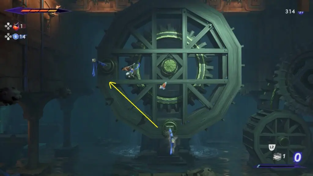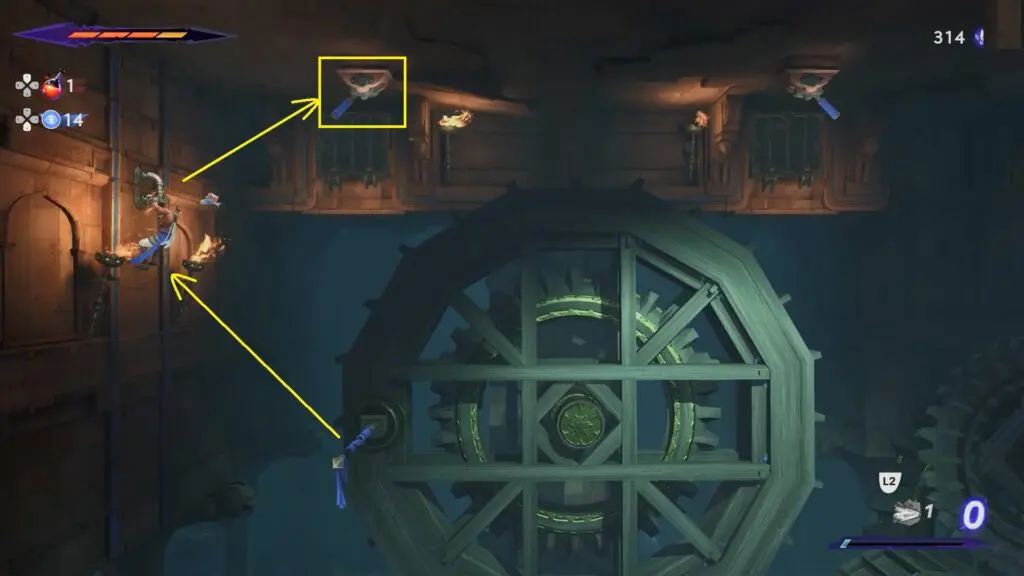 Use the poles at the bottom and left of the giant wheel to jump up to reach the handle on the left wall. Now jump off to the right to hit the first switch on the ceiling with your swords and drop to the ground.