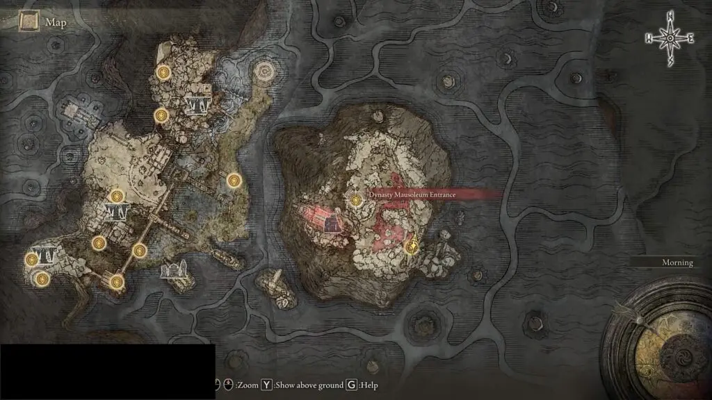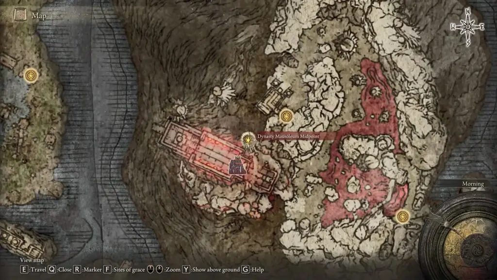 After reaching Mohgwyn Palace, make your way to Mohgwyn Dynasty Mausoleum at the location shown in the picture below. Collect the map there from a corpse. Then proceed ahead and keep climbing the stairs till you reach the top. Enter the building there as shown in the second picture below.