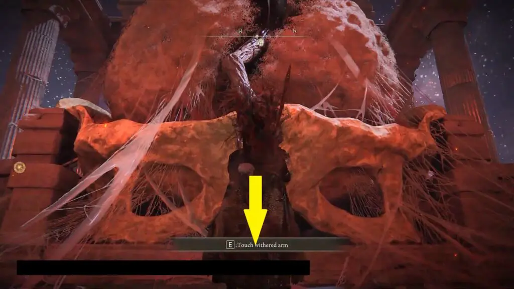 Go back to Mohgwyn palace at the location where you defeated Mohg, Lord of Blood boss as shown in the picture below. There you will find a NPC named Leda as shown in the second picture below. If she does not appear then you won’t be able to access the DLC area. Talk to Leda and then touch the withered arm as shown in the third picture below. Then you will be able to proceed to the Realm of Shadow.