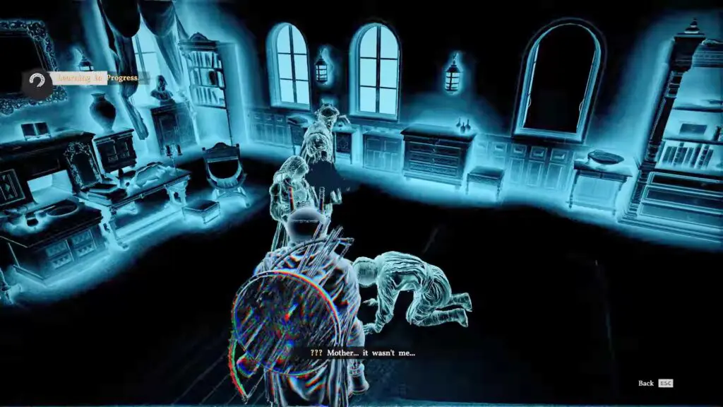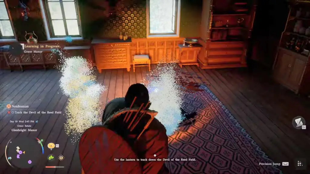 After the conversation, shine the lantern and hold it steady in the room. This will reveal a hidden memory called “Grace Manor.” Continue holding the lantern until the memory is fully learned.
