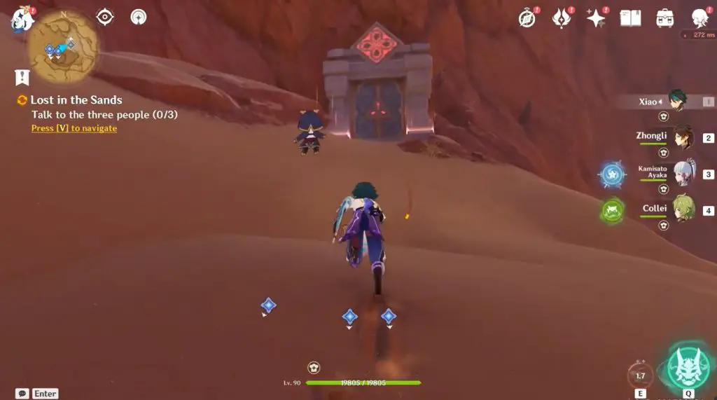 You can find this domain while doing the world quest “Lost in the Sands”. To initiate the quest, head to Aaru Village and talk to a merchant name Bonifaz. He will inform you that the researcher and other villagers left in the west direction and you can find them by following their footprints. This will initiate a questline “Golden Slumber – Lost in the Sands”.
