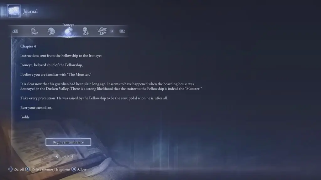 Open your menu at the Round Table Hold and navigate to the Journal section. If you’re eligible, you’ll see the option to “Begin Remembrance.”