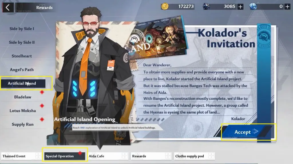 Go to Reward Page and select Special operation. Select Artificial Island from the left panel and then accept Kolador’s Invitation.
