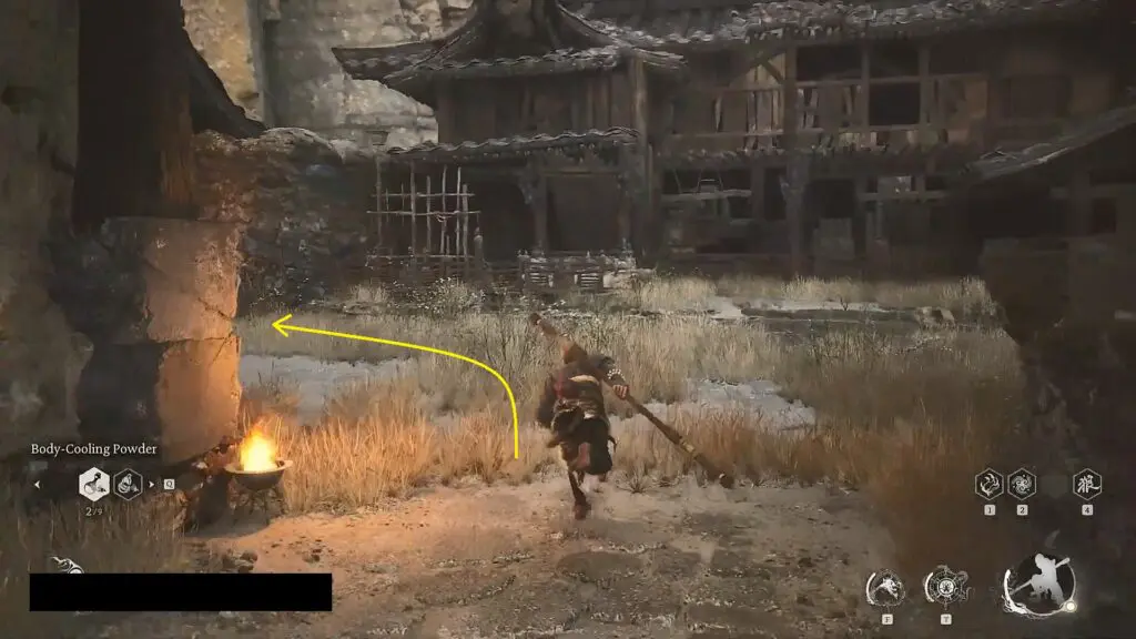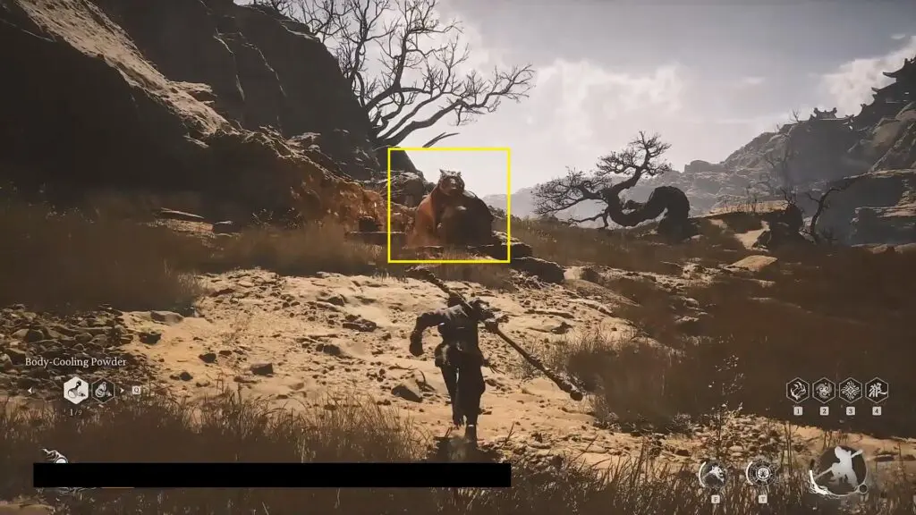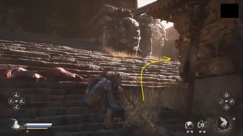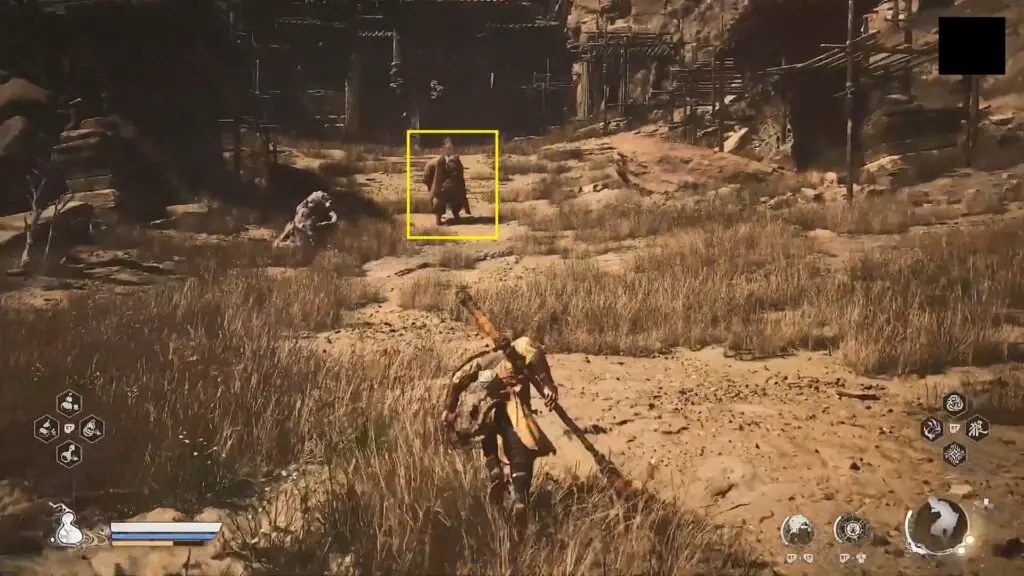 Go back to the area where you first met the boar near the Fright Cliff: Rockrest Flat shrine. Opposite the location where you first met the boar, you will find him again as shown in the picture below (Yellow-Robed Squire). When you approach him, he will attack you for carrying the Arhat Gold Piece (A quest item that you will get automatically by defeating the story boss First Prince of Flowing Sands). After you have defeated the Yellow-Robed Squire, there will be a cutscene and he will pass through the wall at the end of the stairs. Go near the wall and interact with it to reach the secret area “Kingdom of Sahali”.