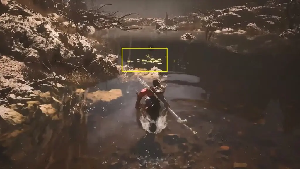 Jade Lotus can be found in the lake at the start of Chapter 2, as shown in the picture below. If you didn’t collect it before, travel to Sandgate Village: Village Entrance shrine. Climb up the stairs next to it and go left along the rocky hill to reach the lake and get the Jade Lotus.