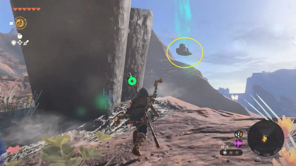 Head to the back of the tower and observe a falling ruin in the sky. Go towards the fallen rock.