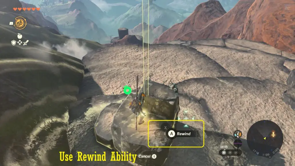 Stand on top of the rock and utilize the rewind ability to ascend into the air. Once you gain enough height, leap and glide to the tower roof.