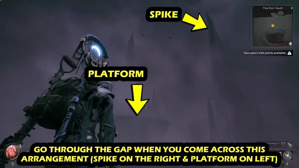Just near the edge, you will find a Spike structure and a platform as shown in the image below. Proceed ahead between this structure and then jump to the small gap to land on the platform ahead.