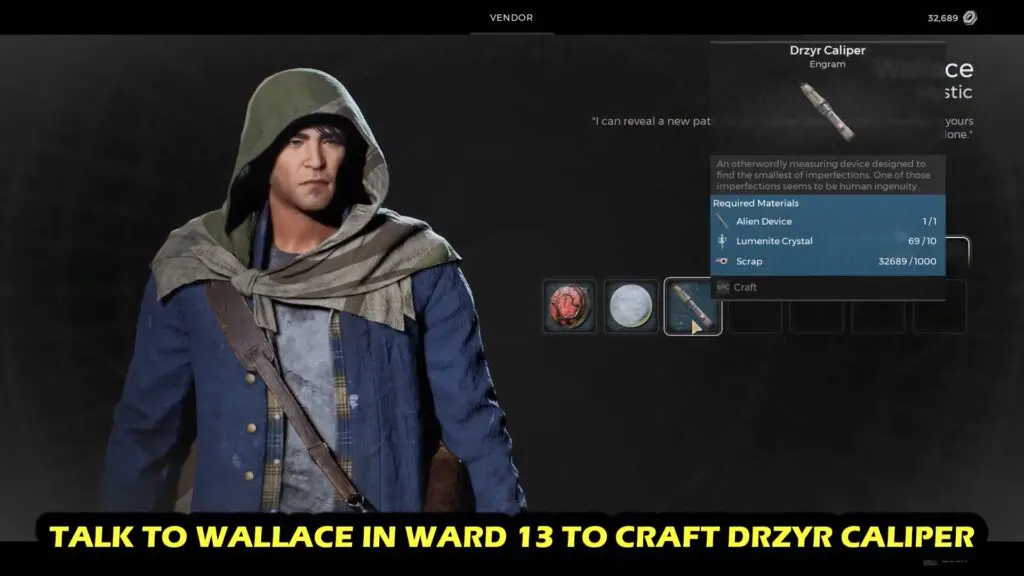 Head back to Ward 13 and talk to Wallace to craft the Drzyr Caliper.