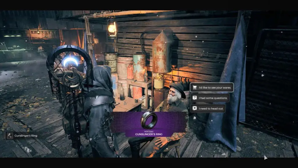 Mudtooth will offer Gunslinger Ring after 15 stories. You can listen to or skip the stories as you like, but you must keep asking until he has no more. He may need time to think and run out of tales temporarily, so you can continue with your campaign and return later.