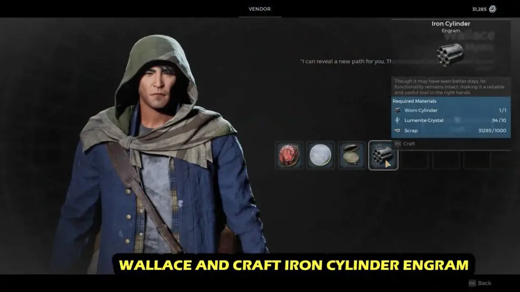 Step 4: Talk to Wallace and Craft Iron Cylinder Engram