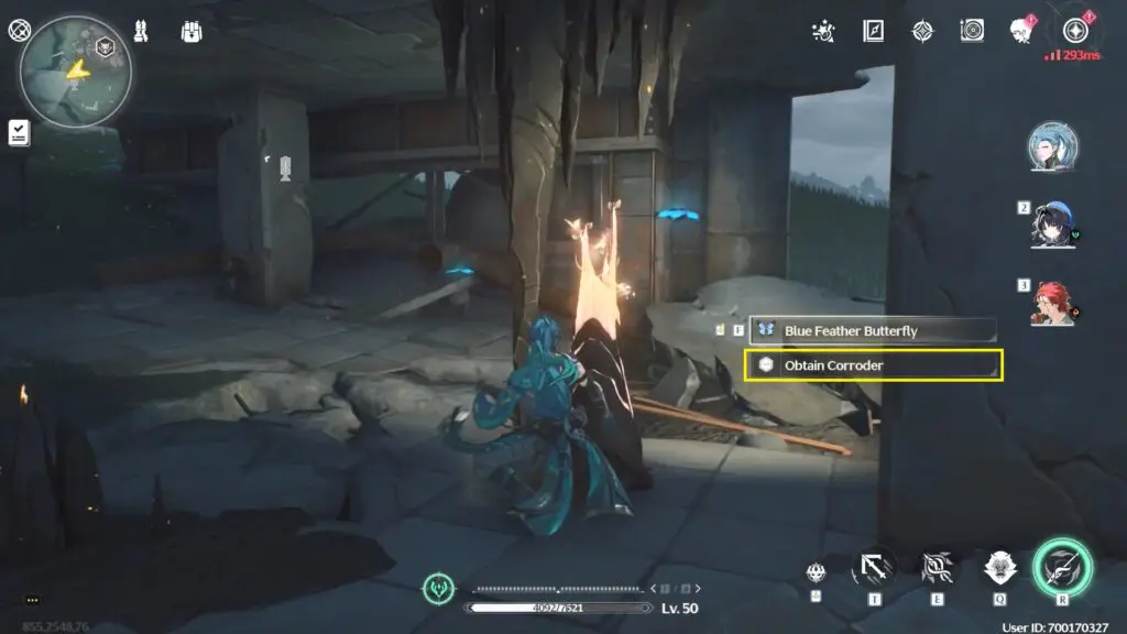 To unlock the Huanglong-Whining Aix’s Mire Resonance Beacon, go to the floor below it on the ground floor. There you will find a black spiky cluster. Interact with it to grab a yellowish butterfly called Obtain Corroder. Ignore the blue butterflies; we don’t need them. Refer to the image below.