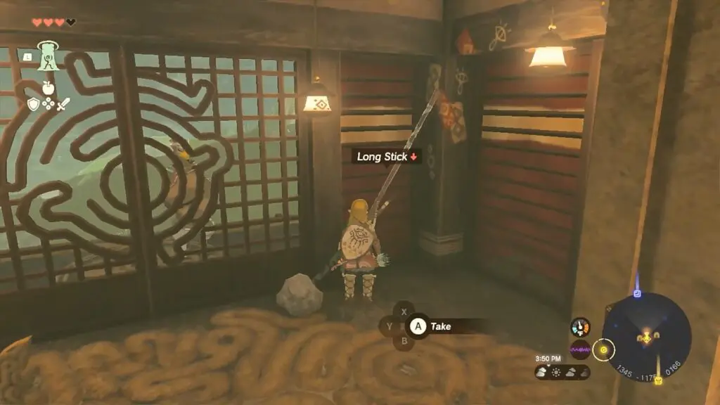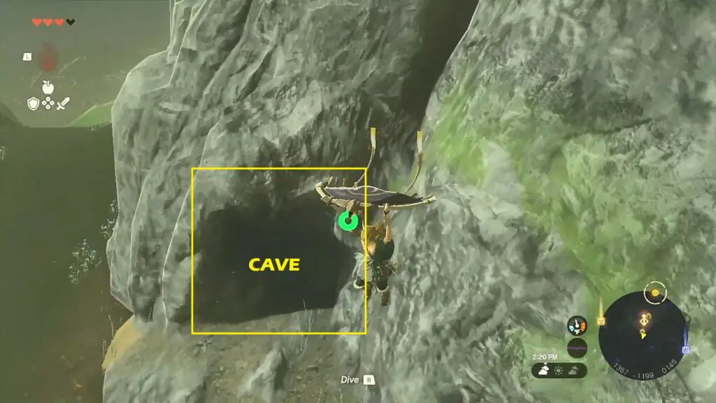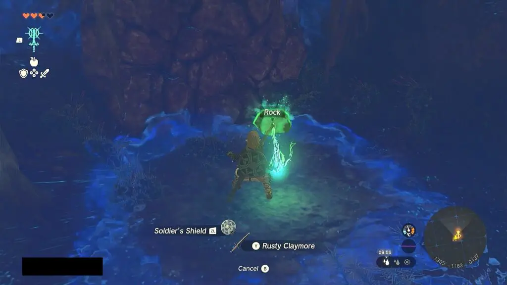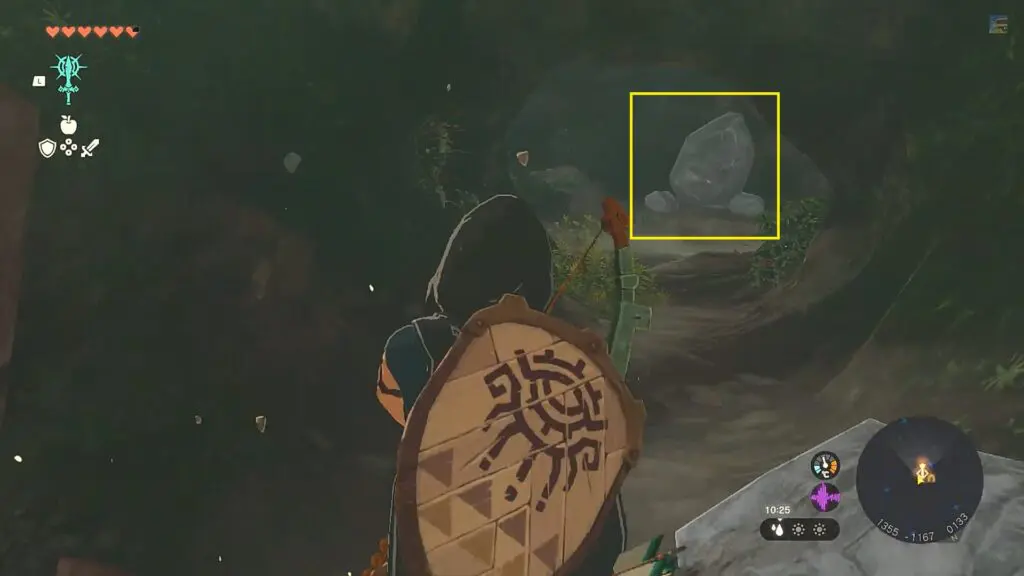 After entering the cave, fuse a weapon with a rock as shown in the picture below to form a hammer. Then use it to dig into the cave. Dig and go to the right side towards the location where the Sahasra Slope Skyview Tower is marked on the map.