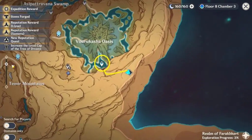 The entrance to the Somalata Inland Sea domain can be found in the Realm of Farakhkert, to the south of a large tree that is situated in the center of the Asipattravana Swamp. Teleport to the waypoint in Vourukasha Oasis as marked on the map and then head west to find the Somalata Inland Sea Domain inside the mountain.