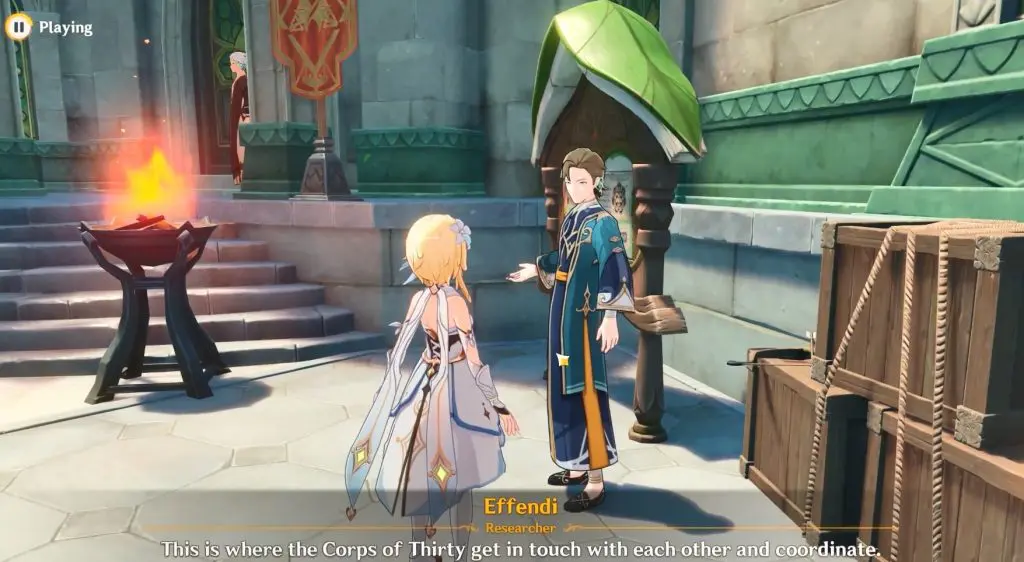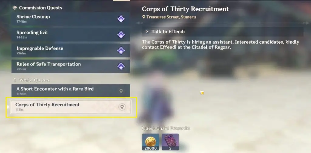 Corps of Thirty Recruitment World Quest, players will need to head to Sumeru City and need only to speak to Effendi the Researcher. You can find Effendi in the eastern part of the city. I have marked the location below.