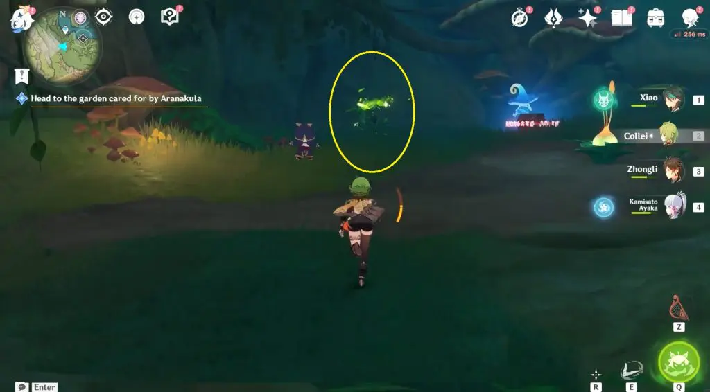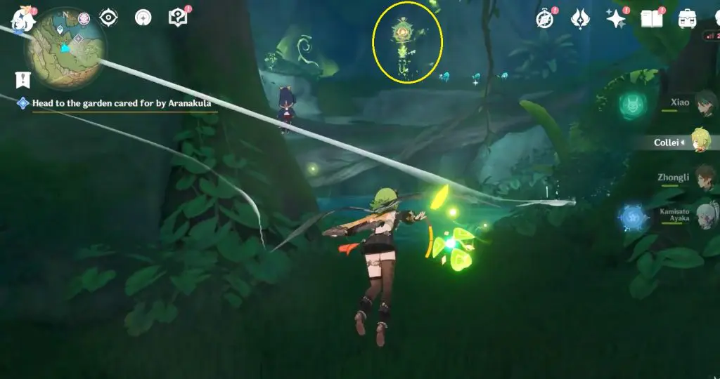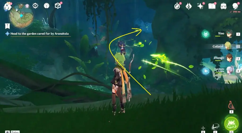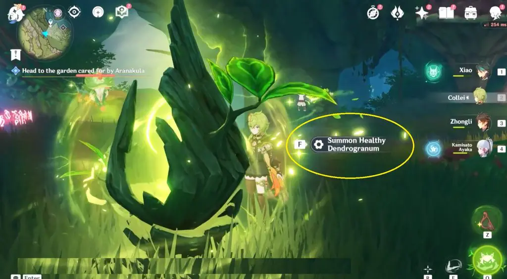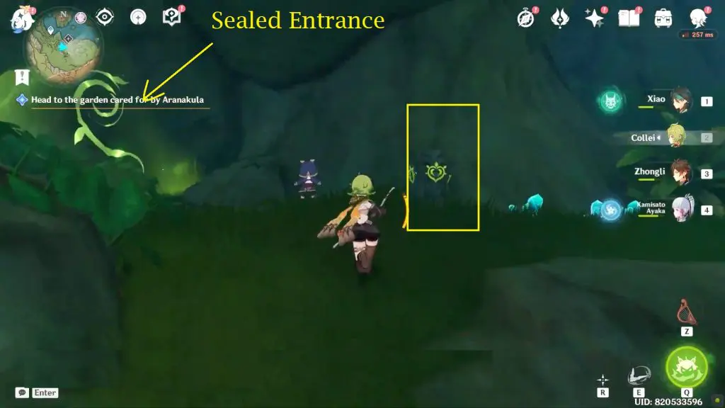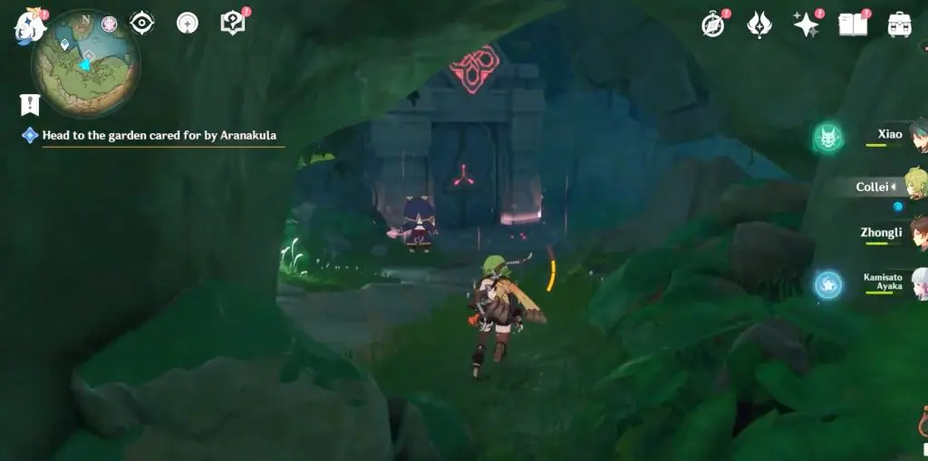 Summon a healthy Dendrograna and then head back to the sealed cave. You will find a floating Dendro object near the seal. Shoot the floating Dendro object to remove the seal.