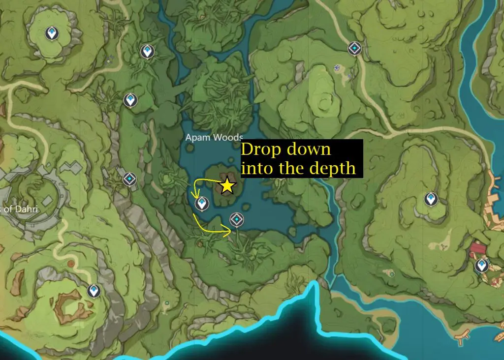 Glide down to the bottom and head in the west direction. Continue to follow the cave deep inside to reach the teleport waypoint as marked on the map.