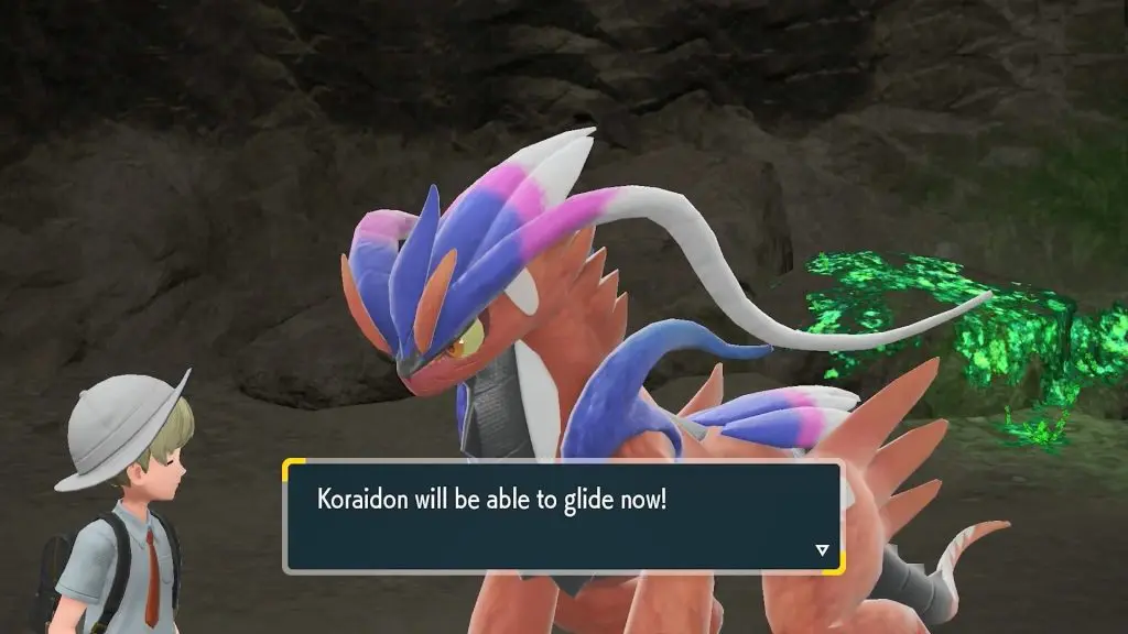 Legendary Ride lets you hop at the back of the legendary Pokemon, Koraidon & Miraidon, and lets you fly (Glide). This ability enables gliding (flying) after jumping from high-altitude areas.